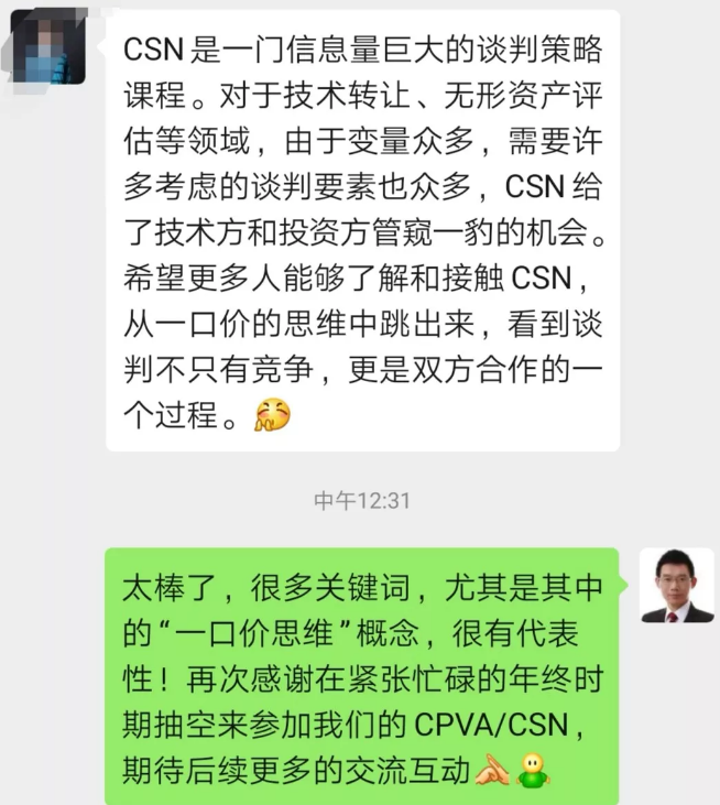 为期6天的CPVA/CSN课程中,各位学员竭其全力排除外界干扰(尤其是在年终时节,大家多有公务在身,以致于课后回去要加班加点复习CPVA/CSN课程+处理案头工作,辛苦各位了!)专注听课、积极讨论,评估技巧、谈判策略于高强度的讲学过程中融入并内化为大家的知识本能。在此,再次给所有人点赞,你们都是最棒哒!![]()