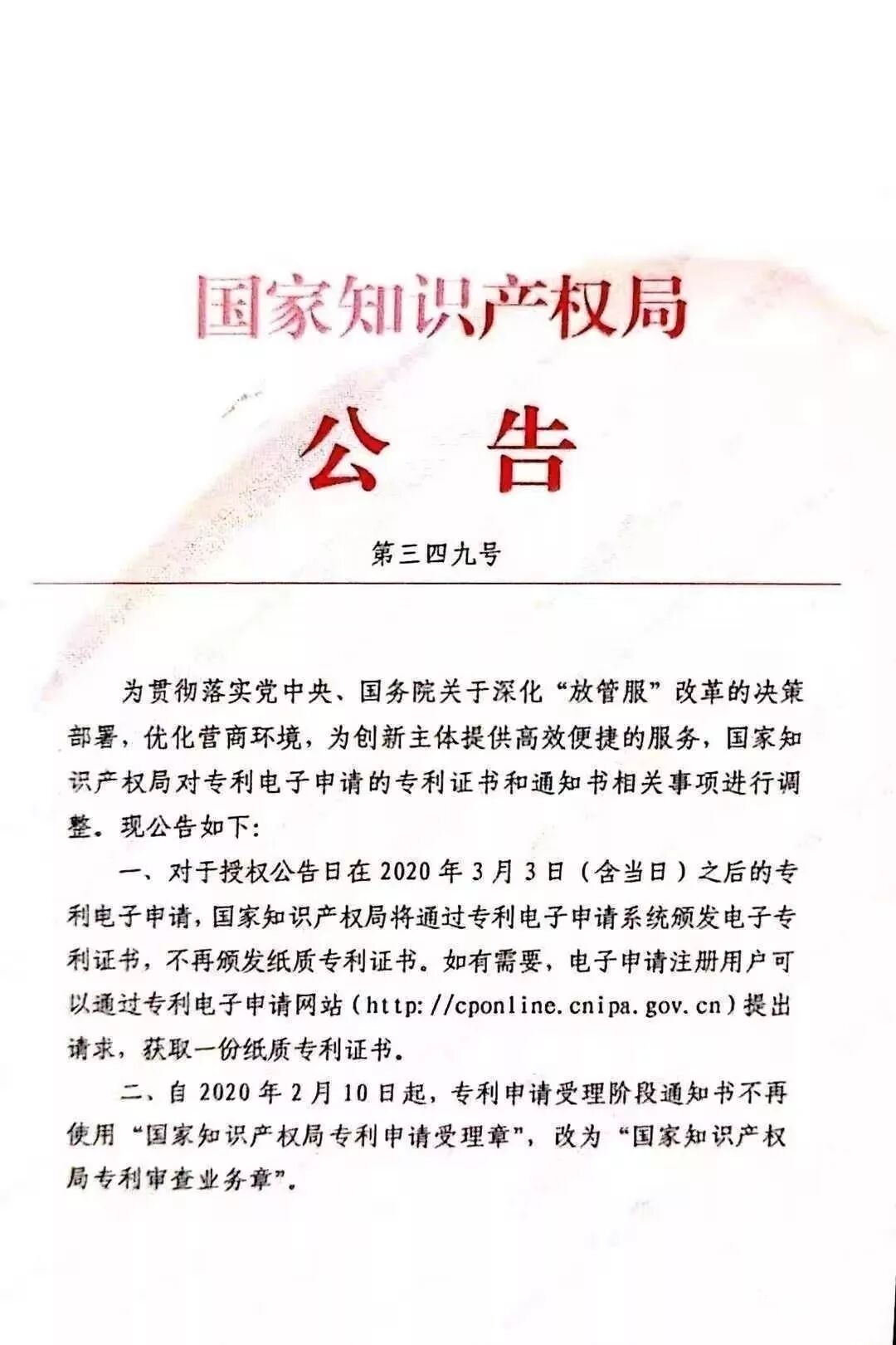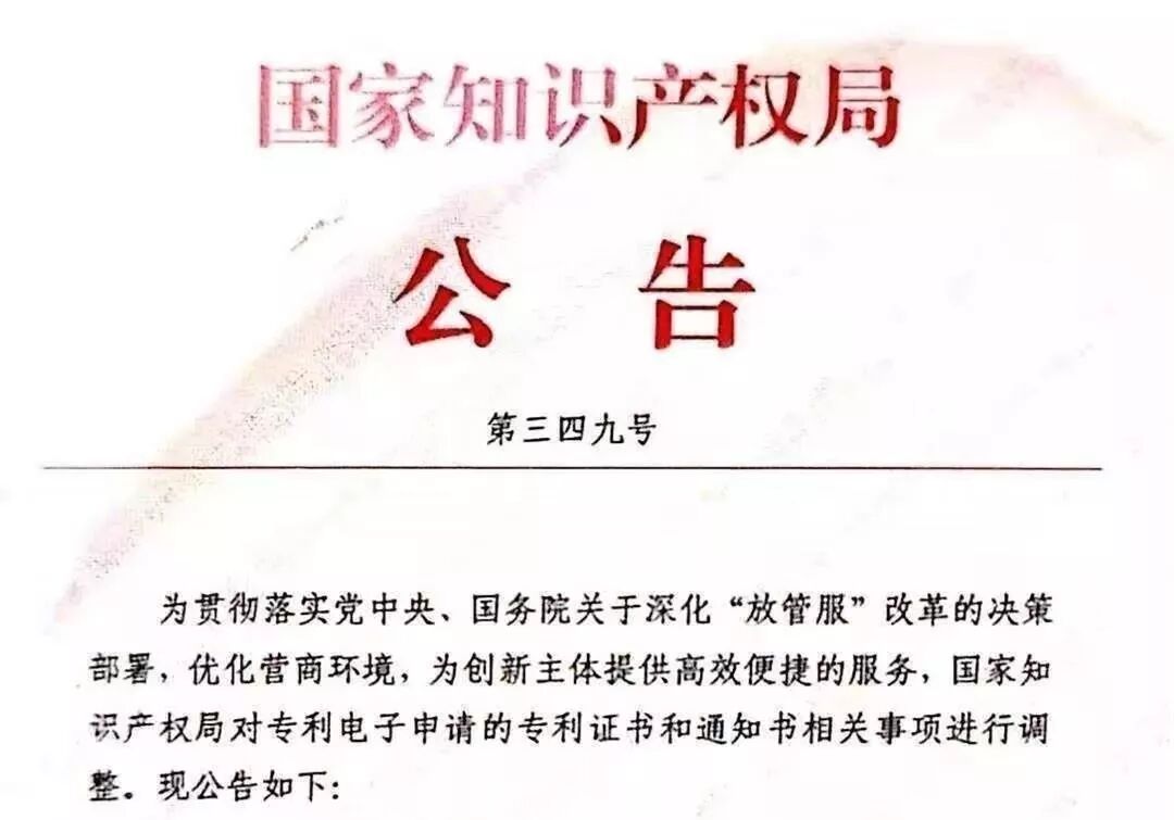 为贯彻落实党中央、国务院关于深化“放管服”改革的决策部署,优化营商环境,为创新主体提供高效便捷的服务,国家知识产权局对专利电子申请的专利证书和通知书相关事项进行调整,现公告如下: